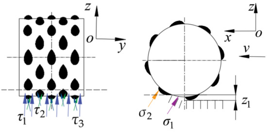 where σ1 and σ2 are the normal stress from the soil to the press roller; τ1, τ2, and τ3 are the shear stress from the soil to the press roller, A2 is the surface area of a single convex hull, n2 is the constant of the convex hull in contact with soil, and A1 is the contact area between the base circle and the soil.