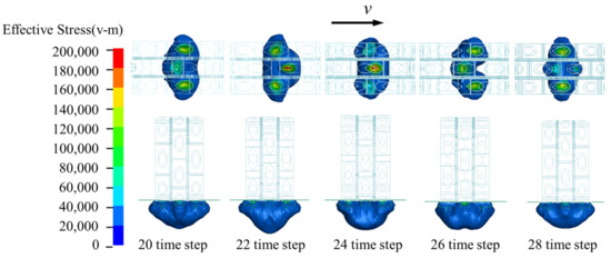As shown in Figure 10, the soil stress field is constantly changing within time steps 22–28, and the soil stress fields corresponding to the time steps 20 and 28 are similar. The possibility of this phenomenon is the state in which the convex hulls on both sides are in complete contact with soil, corresponding to a similar degree of soil deformation. Compared with the other time steps, the time steps 22 and 24 have higher stress. At this time, the convex hull with the soil is bilateral and works together with the central convex hull to form a triangular stress superposition, which has a large overall deformation of the soil. The maximum stress field appears at time step 22. The convex hull on both sides is almost completely in the soil, and the convex hull part of the central base surface is in contact with the soil, which indicates that the convex hull on both sides has a greater impact on the stress field [26,27]. At time step 24, the convex hull of the central base surface is directly below the axis of rotation of the press roller, and the convex hull is in complete contact with the soil, which correspond to the largest stress and soil deformation in the direction of the central base. From time step 22 to 26, the overall stress field is in a medium convex state, which is an ideal stress field. It shows that the bionic pressing roller can increase the contact area between the seed and the soil, improve the seed germination ability, ensure the overwintering ability, and avoid the emergence of “bean sprout” seedlings in the rice–wheat rotation area.