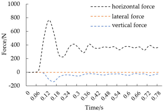 During the operation of a bionic press roller, the relationship between the working force of the press roller and time is shown in Figure 11. Within the time stage of 0–0.06 s, the bionic press roller performs a free fall movement under the action of gravity. In this process, the bionic press roller has no contact with the soil, and the corresponding three-dimensional force is 0. Within the time stage of 0.06–0.12 s, the bionic press roller makes a static pressure movement, and the forward force and vertical force first increase and then decrease, and finally reach stability. At 0.24 s, the forward speed and corresponding rolling speed are applied to the simulation model. After the time reaches 0.42 s, the bionic press roller enters the stable stage, and the three-dimensional force fluctuates within a certain range. Compared with the force in the period of 0.06–0.24 s, the absolute values of forward force and vertical force in the period of 0.42–0.78 s are relatively small as a whole, which indicates that there is a negative correlation between speed and force. The reason for this phenomenon may be that the faster the speed, the shorter the contact time with soil, and the lower the impact on soil deformation, the smaller the corresponding subsidence and the lower the operation force.