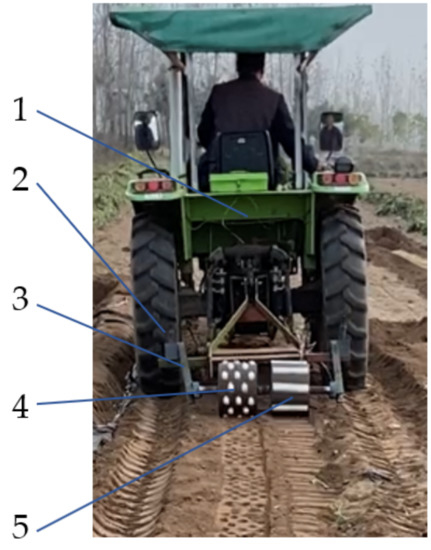 The scenario of verification test. 1. low-power tractor; 2. pressure control system; 3. profile control frame; 4. bionic convex press roller; 5. bionic ridged press roller.