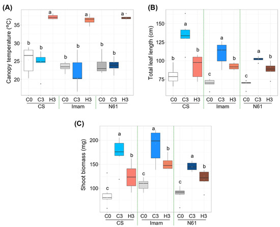 Effect of heat stress on the growth of wheat genotypes Chinese Spring (CS), Imam, and Norin 61 (N61). (A) Canopy temperature, (B) total leaf length, and (C) shoot biomass for (C0) before heat treatment, (C3) control plants after three days, and (H3) plants exposed to heat for three days. Six plants were used for each measurement. One-way ANOVA with post-hoc Tukey HSD test (p < 0.05) was carried out for statistical analysis within a given genotype.