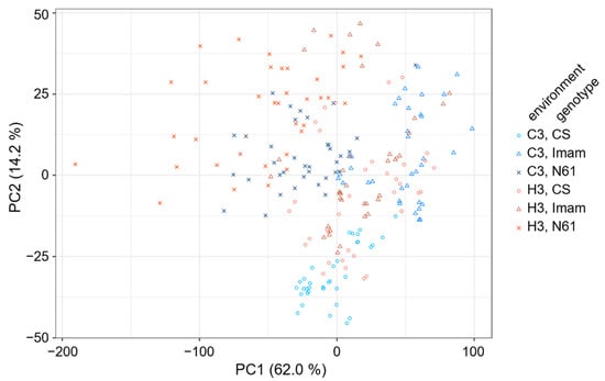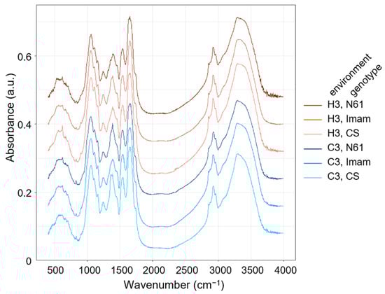 To characterize the spectral patterns of the three wheat genotypes under the C3 and H3 environments, principal component analysis (PCA) was performed. The PC1–PC2 score plot, which explained 76.2% of total variation (Supplementary Figure S1A), showed partial separation between genotypes and environments (Figure 3). For instance, the C3–CS spectra were mostly clustered in the PC2 negative range from −25 to −50, whereas the H3–CS counterparts tended to be positioned at higher PC2 values. The C3–Imam spectra were widely scattered in the PC1 positive range of +40 to +100, whereas their H3 counterparts were mostly situated at lower PC1 values between −20 and +30. The C3–N61 spectra were mostly situated in the PC1 range between −80 and +20, and PC2 ranged between −10 and +20, while their H3 counterparts were mostly spread around the −130 to +10 PC1 range and the −10 to +45 PC2 range. Their loading plots showed a complex pattern over the entire range of 400–3600 cm−1 (Supplementary Figure S1B–D). However, overlapping distributions of different genotypes and environmental conditions were also evident in the PC1–PC2 score plot, suggesting the necessity of applying other chemometrics techniques to characterize their spectral features.