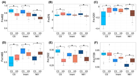 Comparison of FTIR-based biomarkers under heat stress between the three genotypes tested. Boxplots for (A) Fm482, (B) Fm576, (C) Fm1251, (D) Fm1465, (E) Fm1502, and (F) Fm1729 are shown for CS, Imam, and N61 genotypes under C3 and H3 environments. The 36 spectra included each genotype–environment combination. Asterisks represent statistically significant differences at p < 0.01.