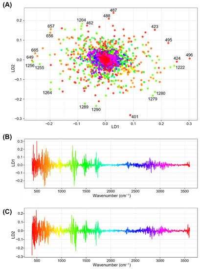 Relationships between the coefficients of the first two linear discriminants (LD1 and LD2) and wavenumbers in linear discriminant analysis (LDA). (A) Two-dimensional scatter plot for the coefficients of linear discriminant LD1 and LD2. Respective points represent the wavenumbers from 400 to 4000 cm−1. Assignment of color gradients to respective wavenumbers are the same as those presented in (B,C). Numbers in black font at respective color points designate wavenumbers for characteristic data points with higher absolute coefficient values (B,C). One-dimensional column plots showing relationships between wavenumbers and coefficients of (B) LD1 and (C) LD2. The coefficient values for each wavenumber are expressed using a rainbow color gradient along their x-axes.