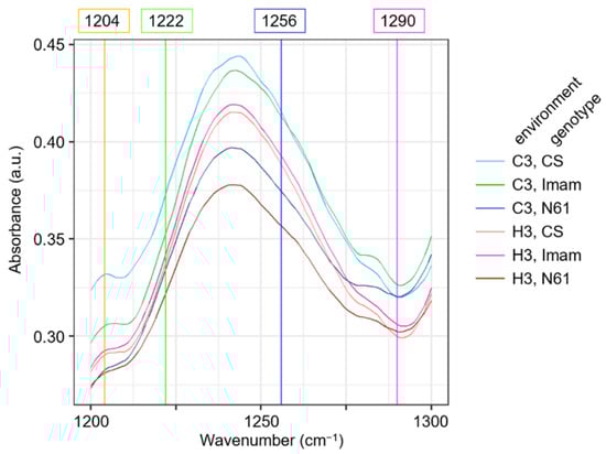 To gain insight into the features of the 1200–1300 cm−1 region, averaged FTIR spectral curves for this region were compared among genotypes and environments (Figure 7). This region contained four characteristic wavenumbers: 1222 cm−1 (LD1 coefficient of +0.247), 1256 cm−1 (LD1 coefficient of −0.262), 1204 (LD2 coefficient of +0.184), and 1290 cm−1 (LD2 coefficient of −0.235) (Figure 6A). The averaged FTIR curves showed that the wavenumbers 1222 cm−1 and 1256 cm−1 were situated in the middle of the ascending and descending curves, respectively, to a peak centered at 1241 cm−1, which has been tentatively identified as C–O stretching, in-plane C–H bending (aromatic), and aliphatic C–O stretching signals [24]. The absorbance values at these wavenumbers for the six environment × genotype combinations were in descending order of C3–CS, C3–Imam, H3–CS, H3–Imam, C3–N61, and H3–N61 (Figure 7), which showed an association with the ascending order of LD1 scores in LDA (Figure 5). This was consistent with the negative LD1 coefficient value for the wavenumber 1256 cm−1, but showed an opposite trend to the positive LD1 coefficient for the wavenumber 1222 cm−1. Although the reason for this discrepancy is currently unknown, one possibility is that the 1222 cm−1 variable may counteract the 1256 cm−1 variable to minimize the within-class variance in the LDA scores, which is a basic characteristic of LDA [58,59]. Another possible factor is that each wavenumber may exert rather small effects, and cumulative actions of multiple wavenumbers are required for the final discrimination. Similar trends were observed for wavenumbers 1204 cm−1 (negative LD2 coefficient) and 1290 cm−1 (positive LD2 coefficient), in which the absorbance values were only partially correlated with the LD2 score (Figure 5 and Figure 7). Overall, these observations suggest that further studies are needed to fully elucidate spectral behavior and underlying biochemical changes during heat stress in a variety of wheat genotypes.