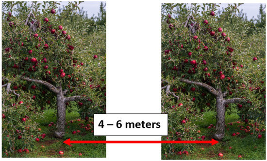 One of the important aspects of managing an apple orchard is to harvest the fruits at the right time, so that the harvested apples are mature enough to be picked and young enough to be transported all over the world [6]. In an automated harvesting system, the apples need to be recognized first before any specialized robotic end-effector can be guided towards them. Therefore, each of the individual apples needs to be recognized from four to six meters away from the respective tree, as the minimum distance between two apple trees is usually around 4 m. Figure 1 depicts the optimal distance between two rows of apple trees in a standard apple orchard. As the recognition process needs to be done from six meters distance, a standard RGB camera is usually used to capture the imaging information, which will include a lot of occluded apples, either full or partial occlusion. It is not unusual for the apples to be heavily occluded by the leaves or other apples, which prompts the automated harvesting system to move around to capture more imaging samples rather than single point imaging. Due to the moving images, some automated systems have even implemented tracking algorithms in order to correlate the images between various captured reference points [7]. Apart from harvesting purposes, it is also important to recognize the apples automatically from a distance, as this information can be used to predict the output yields. An intelligent yield prediction system will allow the manager to better plan the types of apples that need to be planted.