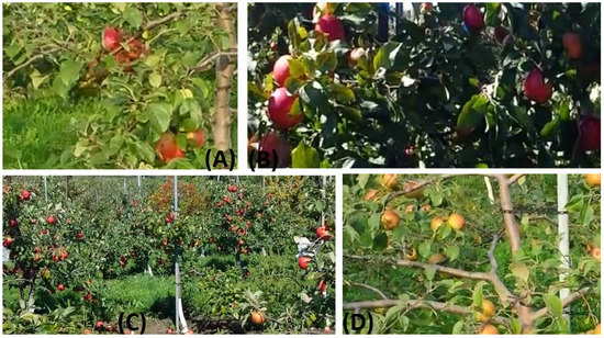 Some challenges encountered by an image-based automated apple recognition system: (A) occlusion, (B) various surrounding illumination levels, (C) variable distance of apple trees, and (D) multiple colors of apple fruits.