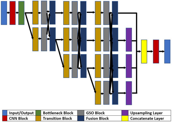 It is interesting to note that GSHR-Net retains the original high-resolution feature map throughout the networks. In the subsequent stages, the original resolution feature maps will be maintained together with the down-sampled feature maps. The lower resolution feature maps are obtained through a convolution operator with a larger stride size, not through the down-pooling process. After the new branch with a smaller scale has been created, each of the separate paths will be passed through the GSO block before the feature maps of various sizes are fused together. There are three variants of the GSO block that have been developed, as detailed in Figure 5.