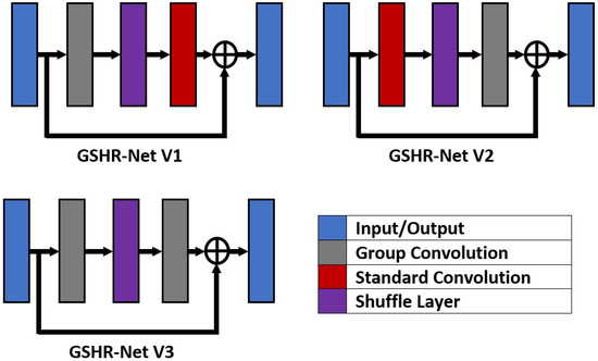The first variant, GSHR-Net V1, consists of a sequence of group convolution, shuffle operator, and standard convolution, which is then combined with a skip connection from the input layer. The second variant, GSHR-Net V2, consists of a sequence of standard convolution, shuffle operator, and group convolution, which is then combined with a skip connection from the input layer. For these two variants, only a single layer of group convolution is implemented. The last variant, GSHR-Net V3, comprises a sequence of group convolution, shuffle operator, and another group convolution, before a skip connection from the input layer is added together at the end of the network block. There are three group settings, which are 2, 4, or 8 groups used in the group convolution process. Each of the settings will be tested for all GSHR variants to find the best segmentation architecture. The shuffling process will mix the incoming channels from different groups to alter the network flow so that the smaller branches can be optimally updated.