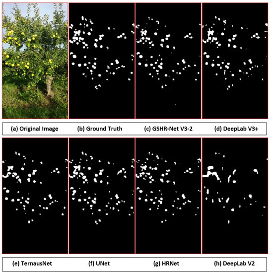 According to Table 1, the best GSHR-Net configuration is GSHR-Net V3-2, which uses two sets of group convolution per one GSO block. GSHR-Net V3-2 returned the best of 0.8045 with a relatively good of 98.835%. In this work, the metric is given the priority over the metric in ranking all the proposed variants, because a good is more important for apple segmentation, as such it is better to have a good overlapping mask between the predicted output and the annotated ground truth mask. However, if the performance is similar for any two variants, then the performance will supplement the ranking value by analyzing the best true detection for both positive and negative labels. It is also important to note that pixels that belong to the apple regions are relatively fewer compared to the pixels that belong to the background. Therefore, the algorithm might return a good performance if it is trained bias for background detection. Hence, in terms of , the best performance is returned by the GSHR-Net V3-8 variant, which divides the feature maps into eight sets of group convolutions that were applied to both convolution layers. The recorded highest value by the GSHR-Net V3-8 variant is 98.861%, but its performance is the lowest among the variants, with only 0.7974. However, if the main concern is the model size, GSHR-Net V3-8 is the best candidate, as it requires the lowest memory capacity of just 5,506,304 parameters. A smaller model size is obtained by GSHR-Net V3-8 since the network applied the highest number of group convolutions, and the connections between the filters are limited to each particular group only. However, all variants can be considered as a lightweight network in general according to the criterion used in [34], whereby only GSHR-Net V2-2 uses more than 10 million parameters. Its total number of parameters is 10,621,184, which is slightly more than the minimum threshold of a lightweight network of 10 million parameters. Table 1 also concurred with our previous argument, whereby if more convolutional groups are utilized in the GSHR-Net, the network will require a lower number of total parameters. A lower set of parameter connections can be observed if the convolution kernels are separated into more groups, which explains the reduction in the number of network parameters.