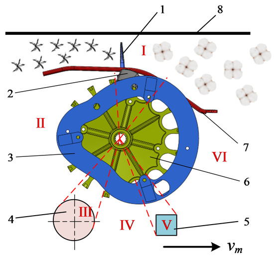 The working principle of the picking mechanism has been demonstrated in Figure 1. The picking head essentially consists of a spindle, crank, groove cam, doffer disk, moistening device, picking roller, grid plate, and pressure plate [24]. The cotton is compressed by the helper in the working process of the picking head and then enters the picking area, specified by I, which comprises the grating and pressure plate. At this time, the spindle, which is solidly connected with the crank, extends the grid plate with the rotation of the picking roller, and the guidance of the groove cam to contact the cotton plant squeezed in picking area I. The spindle with hooked teeth on the surface touches the open boll, and then the cotton fiber is entangled in the spindle due to the high rotational speed of the spindle. The spindle exits the picking area I with the rotation of the picking roller and then enters the stripping area III through the picking transition area II. This area comprises high-speed rotating stripping discs, which quickly strip the seed cotton from the spindle surface to complete the stripping process. The stripped seed cotton is then sent to the cotton box by the airflow conveying system through the cotton pipeline, and the stripped spindle enters the cleaning area V through the stripping transition area IV. The cleaning area consists of a moistening device, which is supplied with spindle cleaner through the pipe to clean the spindle to remove the residual cotton fiber, leaf pulp, and other inclusions on the surface of the spindle. Finally, the seed cotton enters the picking area I through the cleaning transition area VI to complete a picking cycle.