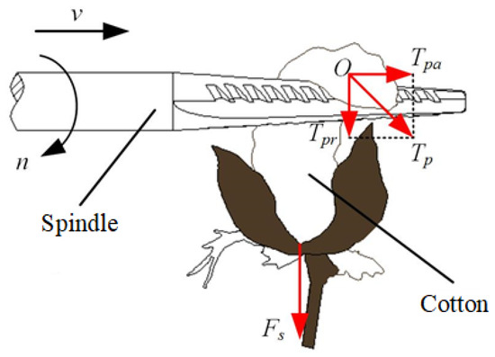 A picking force Tp is formed due to the influence of friction on the cotton surface during spindle cotton picking. Taking a point O at the cotton surface as the analysis object, the picking force Tp can be decomposed to the axial picking force, Tpa, and the radial picking force, Tpr. Therefore, the relationship between these forces is presented by: