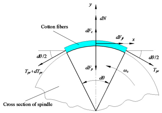 where and in order represent the tension at the right and left ends of the trace length cotton fiber strip, and denotes the frictional force at the axial end of the trace length cotton fiber strip. The infinitesimal forces and in order denote the external pressure and positive pressure at the trace length cotton fiber strip, where the latter results from the picking spindle. Further, is the centrifugal force at the trace length, and is the centrifugal force on the cotton sliver fiber.