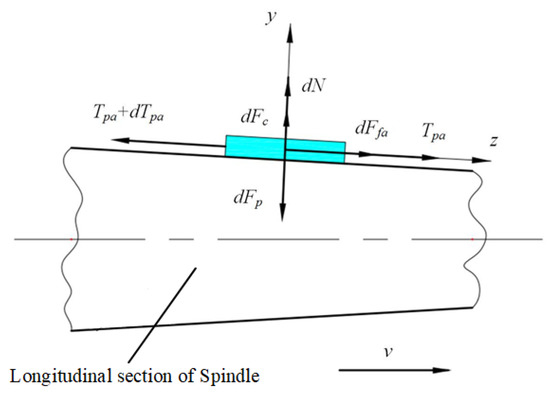In the next step, we proceed to evaluate the axial picking force Tpa. To this end, a trace length of the fiber strip at a longitudinal section at the front end of the spindle with teeth is chosen as the object of understudy. The length of the cotton fiber strip is set as dl, and the spindle radius is R. The force analysis of the trace length of the cotton fiber strip can be conducted based on the free body diagram demonstrated in Figure 4.