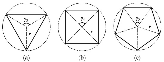 Schematic representation of the spindle head section with various shapes: (a) equilateral triangular section, (b) normal quadrilateral section, (c) regular pentagon section; (note: in the presented subfigures, γ3, γ4, and γ5 are, respectively, the wrapping angles of the equilateral triangle section, the equilateral quadrilateral section, and the equilateral pentagon section, °; r is the circumcircle radius of the spindle head section).