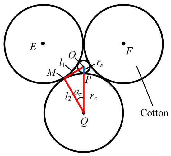 Figure 7 demonstrates that the radius of the bell shell, rc, is employed as the radius of the single cotton because the cotton is compressible, but the bell shell is not easily compressible. According to Figure 7, the centers of three cotton circles are specified by E, F, and Q, while their radius is denoted by rc. In the central position of the three cottons formed at the hole to make the inner circle, the center and radius of the circle associated with the hole are represented by O and rs. The tangential point of circles Q and E is denoted by M, and the tangent point of circles Q and O is signified by p. The lines OM, OP, QM, and QP are connected to obtain the right triangle OMQ, where the angle between the lines QM and QP is denoted by αs (αs = 30°), and the lengths of the segments OM, OP, QM, and QP length are represented by l1, rs, l2, and rc, respectively.
