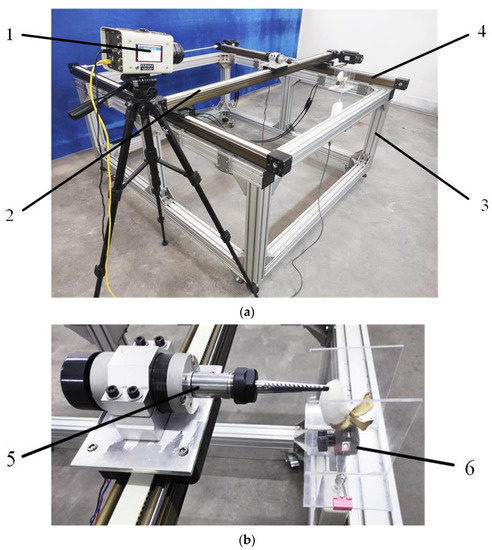 Test bench for dynamic picking performance of the spindle: (a) integrated test graph, (b) partial schematic (note: the consisting parts of the test apparatus are: 1. high-speed camera, 2. X-direction guide rail, 3. frame, 4. Y-direction guide rail, 5. picking ingot driving device, 6. cotton clamping force-measuring device).