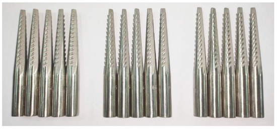 A single-factor test is conducted to clarify the influence law of the angle of the spindle hook tooth on the picking performance. In the present test, slot, tooth front, and tooth inclination angles are the test factors, seed cotton-dumping rate, picking time, and picking force are considered as the evaluation indexes. The widely used spindle parameters of cotton pickers are tooth groove angle 62°, before the tooth angle 89°, and tooth inclination angle 60°. Further, the variation ranges of the test factors are determined based on the relevant literature and previous test results [20,32]: tooth groove angle 54~70°, before the tooth angle 73~89°, tooth inclination angle 50~70°, and the specific picking hook tooth angle parameters are presented in Table 1. The diameter of the spindle is 12 mm. The spindle picking and spindle feed speeds are set equal to 4000 r/min and 1.8 m/s, respectively. The spindle employed in the test is constructed by using a metal 3D printer, as shown in Figure 10.