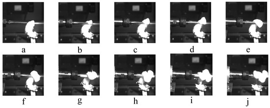 High-speed camera process of the spindle picking a flap of cotton: (a) picking spindle and cotton just contact, (b–c) hook picking stage, (d–h) winding stage, (i) cotton fiber and cotton boll shell will be separated, (j) the completion of picking.