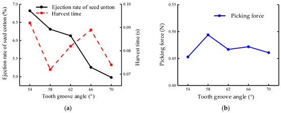 Effect of the tooth angle on the picking performance of the spindle: (a) tooth groove angle (ejection rate of seed cotton and harvest time), (b) tooth groove angle (picking force).
