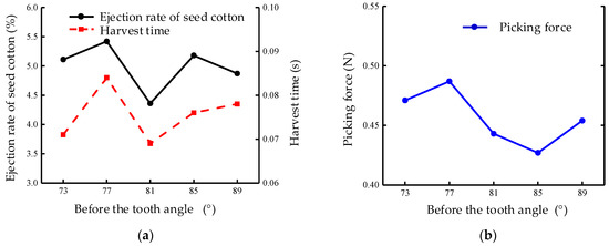 Effect of the tooth anterior angle on the picking performance of the spindle: (a) before the tooth angle (ejection rate of seed cotton and harvest time), (b) before the tooth angle (picking force).