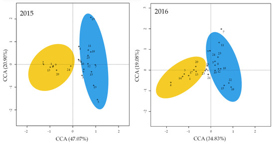 Ordination plot (canonical correspondence analysis CCA) for the complete pool of Coleoptera families found in the olive groves (blue) and shrubland (yellow) in Trás-os-Montes (Portugal) in 2015 and 2016. Ellipses represent the standard deviation. The numbers within the panels correspond to the numbers of the families in Table 1.
