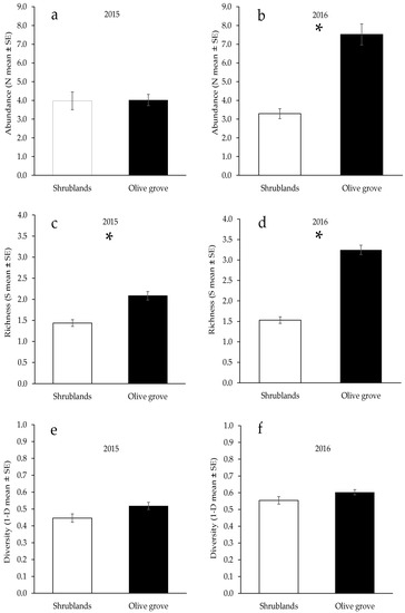 Comparison of the samples of Coleoptera (GEEs) between the two studied habitats (olive grove and adjacent shrublands) in the Mirandela region (Northeast Portugal) in 2015 and 2016. (a,b): Total abundance; (c,d): Richness of families; (e,f): Simpson index for families. Asterisk (*) indicates significant differences between habitats (α < 0.01).