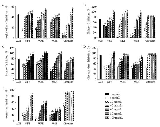 Effect of watermelon extracts and citrulline on carbohydrate-hydrolyzing enzymes. (A) α-glucosidase, (B) maltase, (C) sucrase, (D) glucoamylase, and (E) α-amylase activities of WFE, WRE, WSE, and citrulline at concentrations of 0, 5, 20, 40, 60, 80, and 100 mg/mL were determined. Acarbose (ACB, 1 mg/mL) was used as a positive control. Alphabet lower case letters indicate a statistically significant difference (p < 0.05).