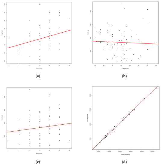 Interdependence between D. moldavica growth and development parameters. (a) branch × height, (b) height × weight, (c) branch × weight, (d) fresh × dry biomass (herba).