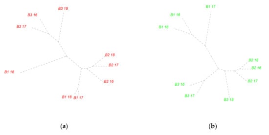 The application of cluster analysis permits the exploration of the full set of traits observed for each factor combination. The influence of row-by-row distance was analyzed through three clusters (Figure 2a–c), where the general impact of year and plant-by-plant distance was revealed. For the 25 cm RR (A1), the only stable group is determined as the 15 cm PP group, independent of the experimental year (Figure 2a). A distance of 25 cm PP produces similar data in the first two experimental years, but increases the height of the plants, which is still not associated with an increase in the other parameters related to yield potential. The continuous row planting shows a similar trend, with the first two years being very close, but a higher distance in the third experimental year. This was due to an increase of more than 20% in the biomass yield and the appearance of another supplementary branch on the plants. At 50 cm RR, there are some changes in the cluster image of the collected data (Figure 2b). There is a slight change between the first two years in the continuous (B1) planting and for the second and third year in the 15 cm PP variants. Both the B1_17 and B2_16 variants exhibit the lowest biomass yields and plant weight. An interesting case is the increase in plant height for samples taken in 2018 from the 25 cm PP variant, with 15–20 cm and one supplementary branch, which does not correlate with either biomass production or plant weight. The most representative cluster is the one that assembled variants at 70 cm RR (Figure 2c). There are two poles on the cluster: one that assembled the plants in continuous rows (B1) and one year from 15 cm PP (B2_17), and the second at 25 cm PP and the other two years from 15 cm PP. The first pole is associated with high yields and also the variants that developed the highest plant height and most branches. The second pole exhibits the lowest yields, associated with medium to low height. This pole is split into two areas by the variant with the highest plant weight (B3_17), which is not correlated with plant height or yield potential. Both 15 and 25 cm PP variants, in the same first and third experimental years, produced similar results in terms of plant height and individual weight.