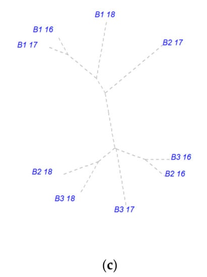 Cluster analysis of plant-by-plant distance May it should be × experimental year interaction, grouped by row-by-row distance. (a) 25 cm RR, (b) 50 cm RR, and (c) 70 cm RR. Factor B—plant-by-plant distance (PP): continuous rows (B1), 15 cm (B2), and 25 cm (B3); Factor C—experimental year 2016 (16), 2017 (17), and 2018 (18).