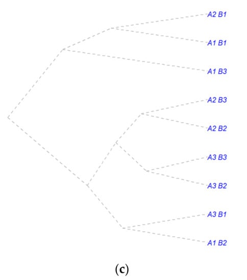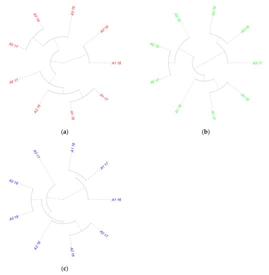 Cluster analysis of row-by-row distance × plant-by-plant distance interaction grouped by experimental year. (a) Experimental year 2016; (b) experimental year 2017; and (c) experimental year 2018. Factor A—row-by-row distance (RR): 25 (A1), 50 (A2), and 70 (A3) cm; Factor B—plant-by-plant distance (PP): continuous rows (B1), 15 cm (B2), and 25 cm (B3).