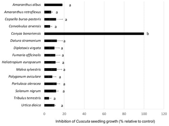 Allelopathic effects of dichloromethane extracts of fifteen weed species on growth of Cuscuta campestris seedlings expressed as percentage of inhibition compared to the control. Bars with different letters are significantly different using the Tukey test (p = 0.05). Error bars represent the standard error of the mean.