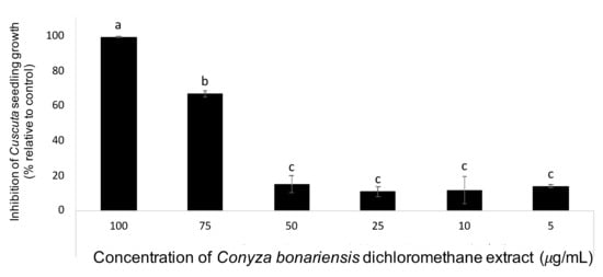 Dose–response screening of the phytotoxic activity on Cuscuta campestris seedling growth of Conyza bonariensis dichloromethane extract. Treatments with different letters are significantly different using the Tukey test (p = 0.05). Error bars represent the standard error of the mean.