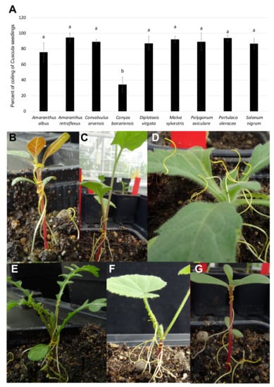 Compatibility of seven day-old Cuscuta campestris seedlings with a collection of 9 weed species. (A) Percentage of Cuscuta seedlings that coiled around weed plants, and illustrative photographs showing the coiling of Cuscuta seedlings on the stems of (B) Amaranthus albus; (C) Convolvulus arvensis; (D) Conyza bonariensis; (E) Diplotaxis virgata; (F) Malva sylvestris; (G) Portulaca oleracea. Treatments with different letters are significantly different according to the Tukey test (p = 0.05). Error bars represent the standard error of the mean.