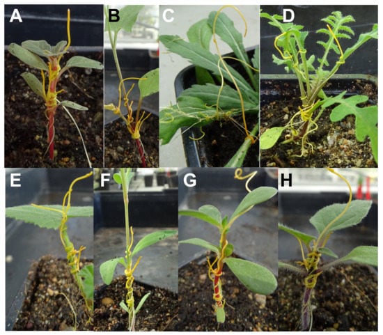Illustrative photographs of Cuscuta campestris posthaustorial growth at the site of attachment on (A) Amaranthus albus; (B) Convolvulus arvensis; (C) Conyza bonariensis; (D) Diplotaxis virgata; (E) Malva sylvestris; (F) Polygonum aviculare; (G) Portulaca oleracea; (H) Solanum nigrum.