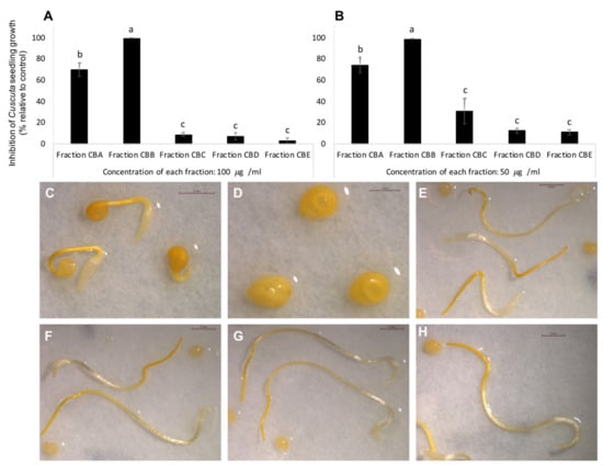 Allelopathic effects of five homogeneous fractions obtained from Conyza bonariensis dichloromethane extract on growth of six day-old Cuscuta campestris seedlings applied at (A) 100 µg/mL and (B) 50 µg/mL. (C–H) Photographs illustrating the development of Conyza seedlings when treated with: (C) C. bonariensis first fraction CBA; (D) C. bonariensis second fraction CBB; (E) C. bonariensis third fraction CBC; (F) C. bonariensis fourth fraction CBD; (G) C. bonariensis fifth fraction CBE; and (H) control treatment. In each Figure 5A,B, treatments with different letters are significantly different using the Tukey test (p = 0.05). Error bars represent the standard error of the mean.