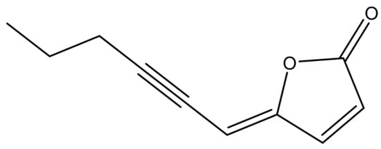 The investigation of the active fraction CBB, by the study of the 1H NMR and ESI-MS spectra, revealed that it consisted in a pure compound, which was identified as (4Z)-lachnophyllum lactone, the (Z)-5-(hex-2-yn-1-ylidene)furan-2(5H)-one (Figure 6, Rf = 0.76, 5.10 mg). Its structure was confirmed by comparison of the 1H-NMR data with those reported in the literature [26,37,38]. The configuration of the double bond was deduced from the presence of coupling between H-5 with H-3 and H-2 in the NOESY spectrum (Figure S1). In addition, the chemical shifts of H-5 (δ = 5.33) and C-5 (δ = 94.5) were very similar to those previously reported for lachnophyllum lactone and other natural furanones, with an α Z-disubstituted vinyl group, substantially differing from those having a E-vinyl group [38,39,40,41]. This structure was confirmed by the data of its ESI-MS spectrum which showed the sodiated adduct [2M + Na]+ and protonated [2M + H]+ dimers, and protonated [M + H]+ ions at m/z 347, 325 and 163, respectively. This lactone with unspecified configuration was previously reported from different plant species [26,37,38,42]. The 1H NMR data of the (Z) and (E) isomers of the acetylenic lactone were reported when both the compounds were isolated from Baccharis paniculata. A clear upfield shift of proton H-5 was observed for the Z-isomer [38].