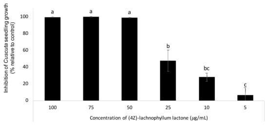 Dose–response screening of the phytotoxic activity on Cuscuta campestris seedling growth of (4Z)-lachnophyllum lactone. Treatments with different letters are significantly different using the Tukey test (p = 0.05). Error bars represent the standard error of the mean.