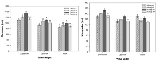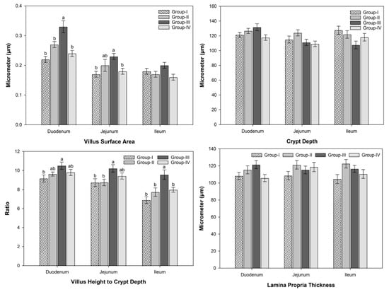 The effect of the organic-acid–phytogen composite on broiler gut morphometry is shown in Figure 1 and labelled in the Figure 3a. The gut histomorphometric parameters showed that the VH and VH/CD ratio of all intestinal segments were higher (p ≤ 0.05) in group III as compared to the control. The VSA was higher (p ≤ 0.05) in duodenum and jejunum in group III compared with the control. The thickness of the muscularis externa was greater (p ≤ 0.05) in the ileum of the control group when compared with group IV.