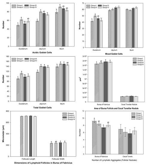 Graphical representation of the histomorphometry of immune organs and cells in broilers. Different superscripts (a,b,c) correspond to varying levels of significance between groups.