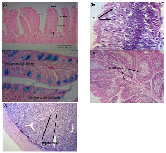 (a) Villi of the small intestine stained with H&E stain at 4x; VH means villus height, VW means villus width, LPT means lamina propria thickness, CD means crypt depth. (b) Intraepithelial lymphocytes in the villi stained with H&E at 40x. (c) Acidic and mixed goblet cells in the villi stained with combined alcian blue-periodic acid Schiff stain at 40x. (d) Bursa of fabricius follicles stained with H&E stain at 4x. (e) Cecal tonsil nodules stained with H&E at 10x.