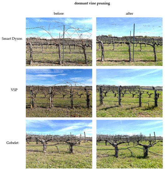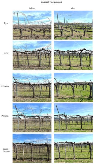 Training systems depicting before and after dormant vine pruning operations. Training systems divided into horizontally divided canopy (Lyre, GDC and Y-Trellis), vertical canopy (Pergola, Single Curtain, Smart Dyson and VSP) and head-trained (Gobelet).