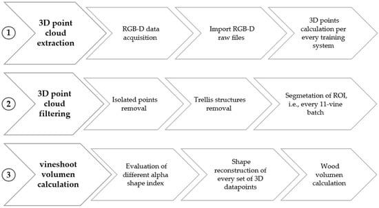 In order to calculate the volume enclosed by the vineshoots from the different pruning systems, the alpha shape [56] algorithm was utilized to wrap the set of the corresponding 3D points due to its accurate performance [16,57,58]. The alpha-shape indicates how tightly the body fits the points and represents the contour that envelopes a set of 3D points [16,48,58]. The fitness level is determined by the index. The tighter the surface to encapsulate a group of 3D points, the closer the shape matches the points as the value decreases. The goal of this research was to obtain a solid, free of voids, while enclosing the smallest volume. The determination of an optimum value for α is absolutely critical for volume calculation. Variations in alpha-shape were also evaluated using index values of 0.1, 0.3, 0.5, 0.7 and 0.9 to calculate the most proper shape of the vineshoot. To address this calculation, the R package alphashape3d [59] was employed to compute volumes according to a specific α index. Higher values resulted in looser shapes, whereas lower values led to tighter shapes. The vineshoot volume was automatically retrieved by the algorithm. The entire 3D modeling process can be seen in Figure 3.