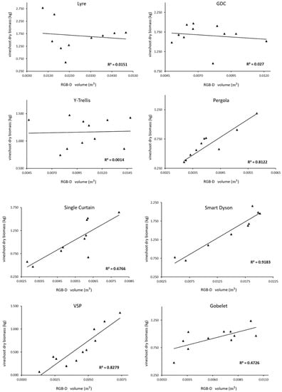 Regression analyses comparing actual vineshoot biomass (measured ground truth) versus RGB-D vineshoot volume per each training system.