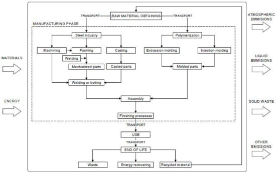 Metals (steel and stainless steel) have always been subjected to more than one process. There are two major groups: machining and shaping, and foundry. For the machined parts, it was considered appropriate to start from an area of the laminated sheet of the proper thickness and size to minimize the loss of material to machine the piece. Machining processes included shear cutting, laser cutting, turning, drilling, threading, and punching. Forming processes include folding, surfacing, drawing, wiredrawing, forging, and bending. As for the forming, the pieces were made of gravity-filled sand mold. The process that generated the most surplus material was cutting and punching, as it started from pieces of sheet metal with a rectangular shape and with the minimum sizes that allowed the whole piece to be included inside (bounding box). The difference between the weight and the weight of the piece was surplus material. In the case of turning, drilling, and threading the loss of material coincides with the volume machined in each piece. Forming processes did not suffer from material loss. For the foundry, an additional 20% of the material was considered necessary with respect to the weight of the piece, which corresponded to the bale and the feeding ducts.