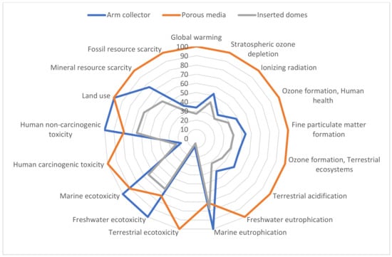DOM-3 scenario did not yield the minimum impact value in only two categories: human carcinogenic toxicity and marine eutrophication. The main factor involved in human carcinogenic toxicity is electricity consumption. The equipment used for generating electricity, including that of renewable energies such as photovoltaic solar, requires large amounts of steel. The steel needs Chromium VI for its production, which has a human carcinogenic impact [50]. However, the specific difference between ARM-3 and DOM-3 is due to the use of more steel sheets for building the filter in DOM-3. The electricity consumption was also the main factor that contributed to marine eutrophication, but the differences observed between POR-1 and DOM-3 were caused by the different manufacturing processes, namely in the replacement of steel foundry of DOM-3 with a carved laminated sheet in POR-1 for the upper filter cover. However, the differences in this impact between these two scenarios were very small.