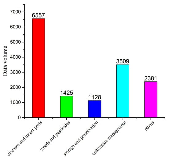 - All kinds of problems are unevenly distributed. In the corpus, the data volume of diseases and insect pests, cultivation management and other three categories is large, while the data volume of weeds and pesticides, storage and preservation is small. The specific data volume category distribution is shown in Figure 1.