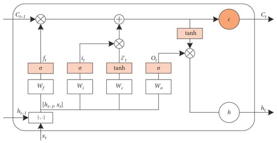 In the formula, xt represents the current input information, ht−1 represents the historical hidden layer information, represents the sigmoid function, tanh represents the hyperbolic tangent function, represents the vector corresponding to the bit-by-bit multiplication operation, and W and b represent the trainable parameters in the model. The LSTM network structure diagram is shown in Figure 3: