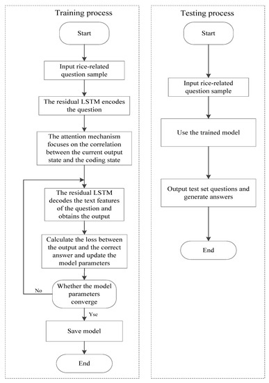 We used the ResLSTM neural network for encoding and decoding in this paper. The initial learning rate of the model was set to 0.01, the number of hidden layer nodes was set to 100, and 50 rounds of training were set. We used the Pytorch deep learning framework to build a neural network. In the experiment, we divided 15,000 question-and-answer pairs into training sets and test sets according to the ratio of 9:1, and a random gradient descent algorithm updated the model weights. There were 13,500 pairs of training sets and 1500 pairs of test sets. We trained the ResLSTM-Attention-Seq2seq model with the data set constructed in this chapter. When the model began to converge, we saved the model and related parameters. The specific steps are as follows: first, 13,500 pairs of standard rice question-and-answer pairs are input as training sets, and the neural network encodes the question text; then, the loss between the generated answer and the correct answer of the rice question answering model is calculated, and the model parameters are updated; finally, when the model loss function converges, the weight of the model network parameters is saved. The model training process and testing process are shown in Figure 7.